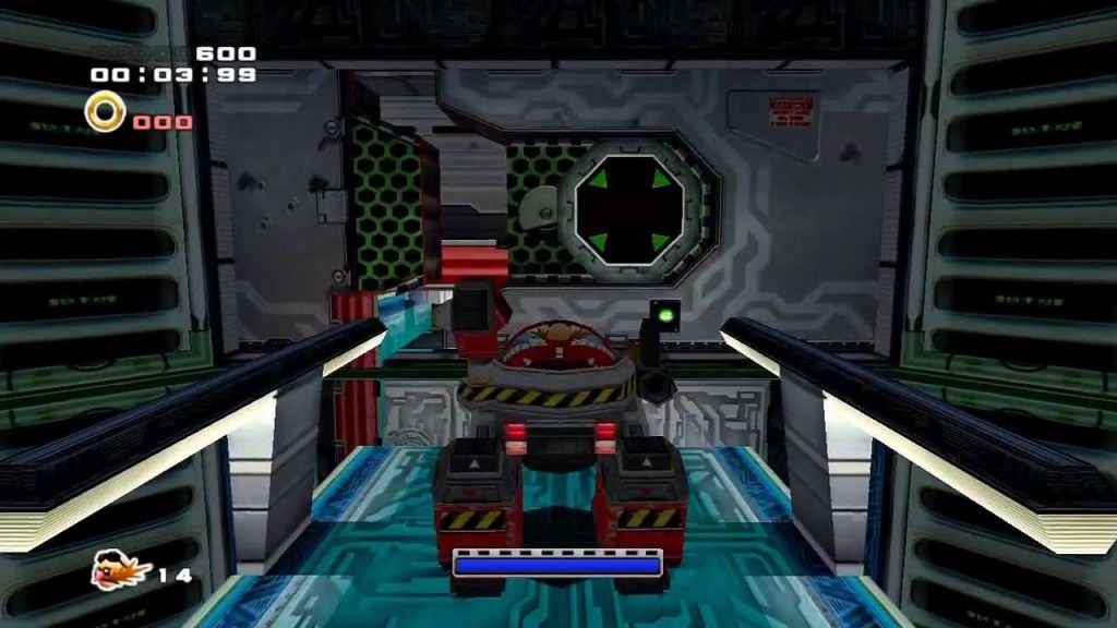 Tails and Eggman ride in mechs and have to blast through barrages of enemies and other obstacles to survive, this game play style uses the most puzzles often hiding buttons that need to be shot to open doors.