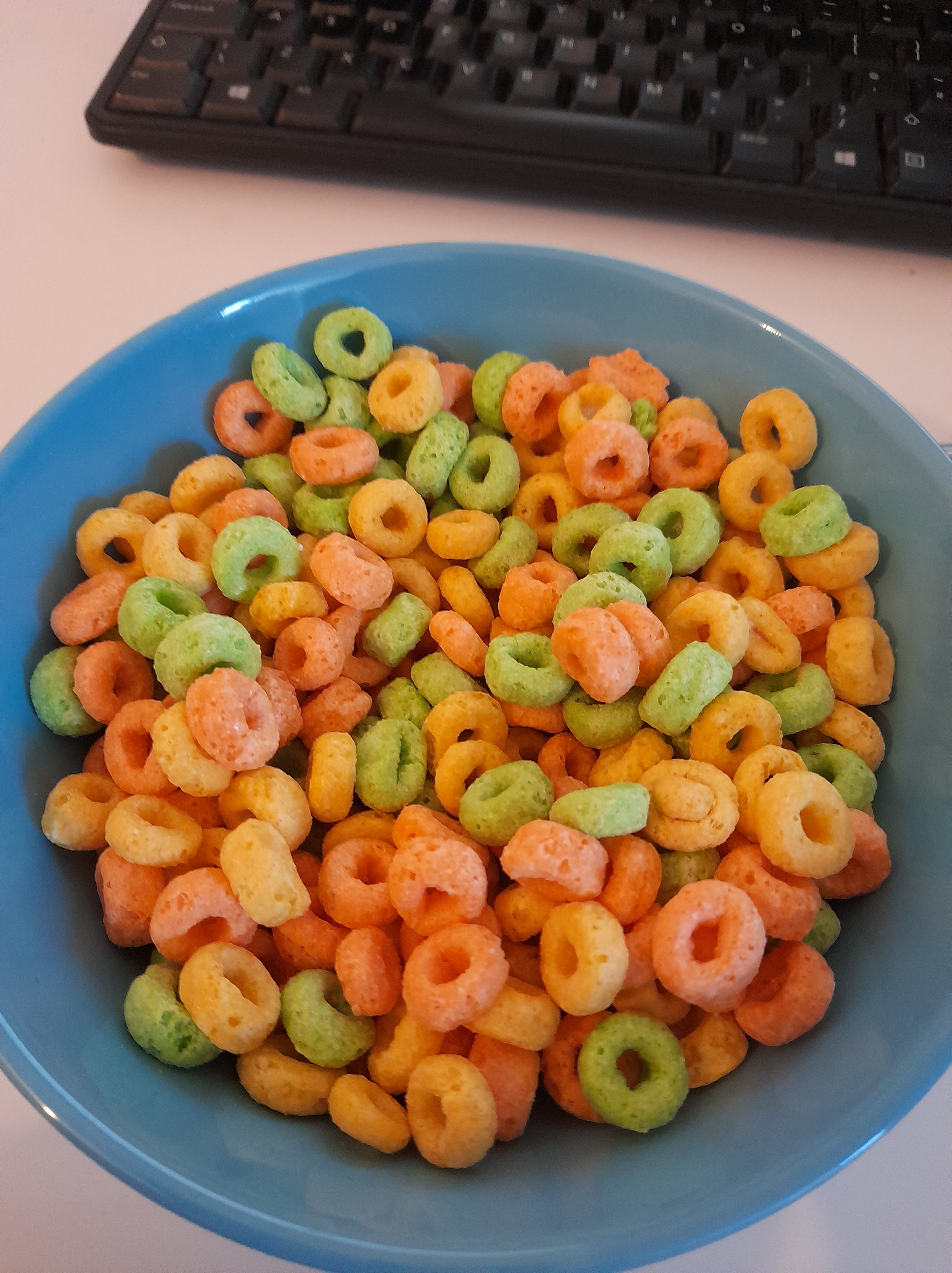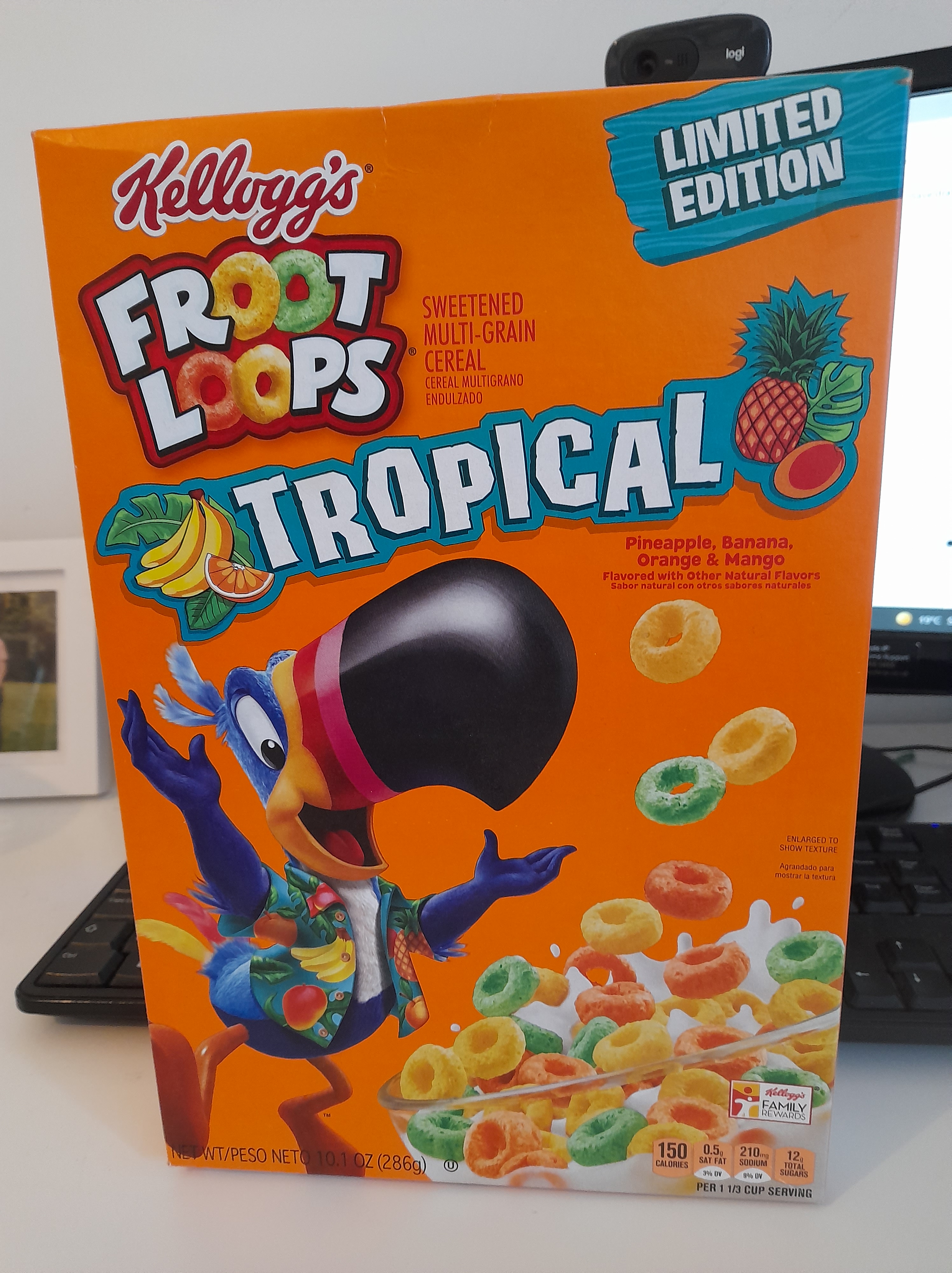 Froot Loops Tropical is a limited edition varient of Froot Loops Cereal from Kellogs. In the UK we got a version of Froot Loops with a lot of flavour taken out of it due to our sugar laws, our version is quite depressing and is not very popular. I haven’t eaten the USA version of Froot Loops in over 20 years so I cant remember what its like, I will be reviewing this version as a stand alone product as I am unable to compare it to the original.