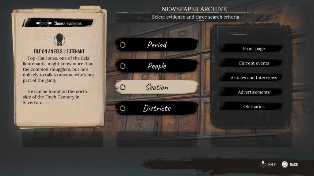 There are three archives you can visit, Police (Crimes), Cordona Chronicle (News) and Cordona City Hall (Official/Legal Documents). Depending on your clue you need to decide which will be the most useful to visit, you first need to select your clue from your case file then you can choose three key words to try and match some further information. For example if I was looking for a news article about an escaped monkey in Scaladio 100 years ago I would visit Cordona Chronicle and would search 1700’s – Front Page – Scaladio and that would then match the correct information.